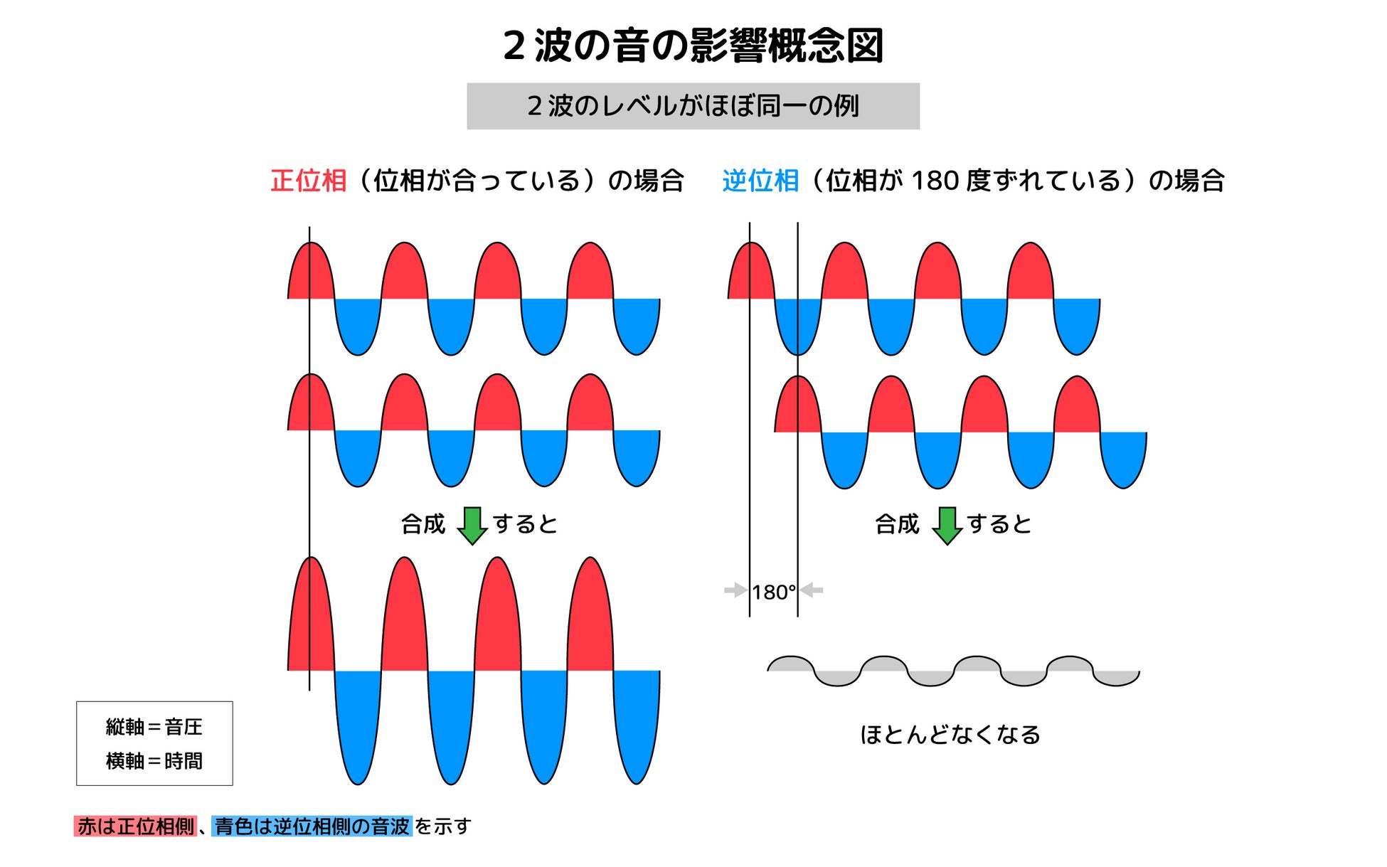 ビームフォーミング技術は、騒がしい環境で通話者の音波信号をマイクに入れることができる技術です。音波の位相(いそう)は重ねると大きくなり、ずらすと小さくなります。通話者の声の音波を重ねて大きくし、ノイズの音波はずらすことで小さくすることができます。
