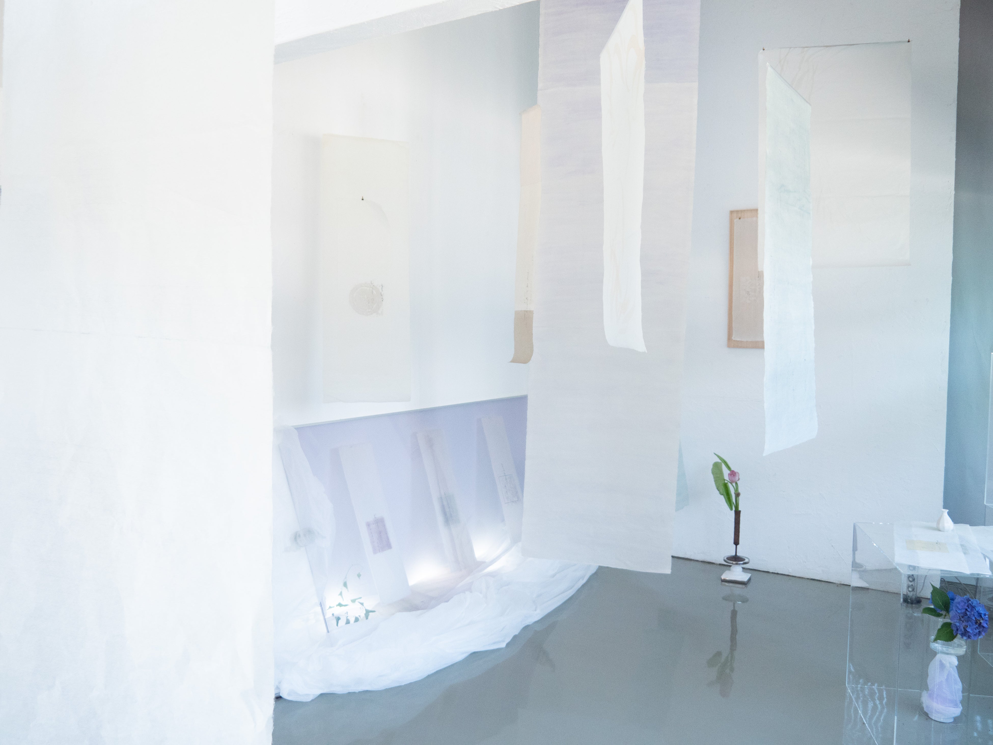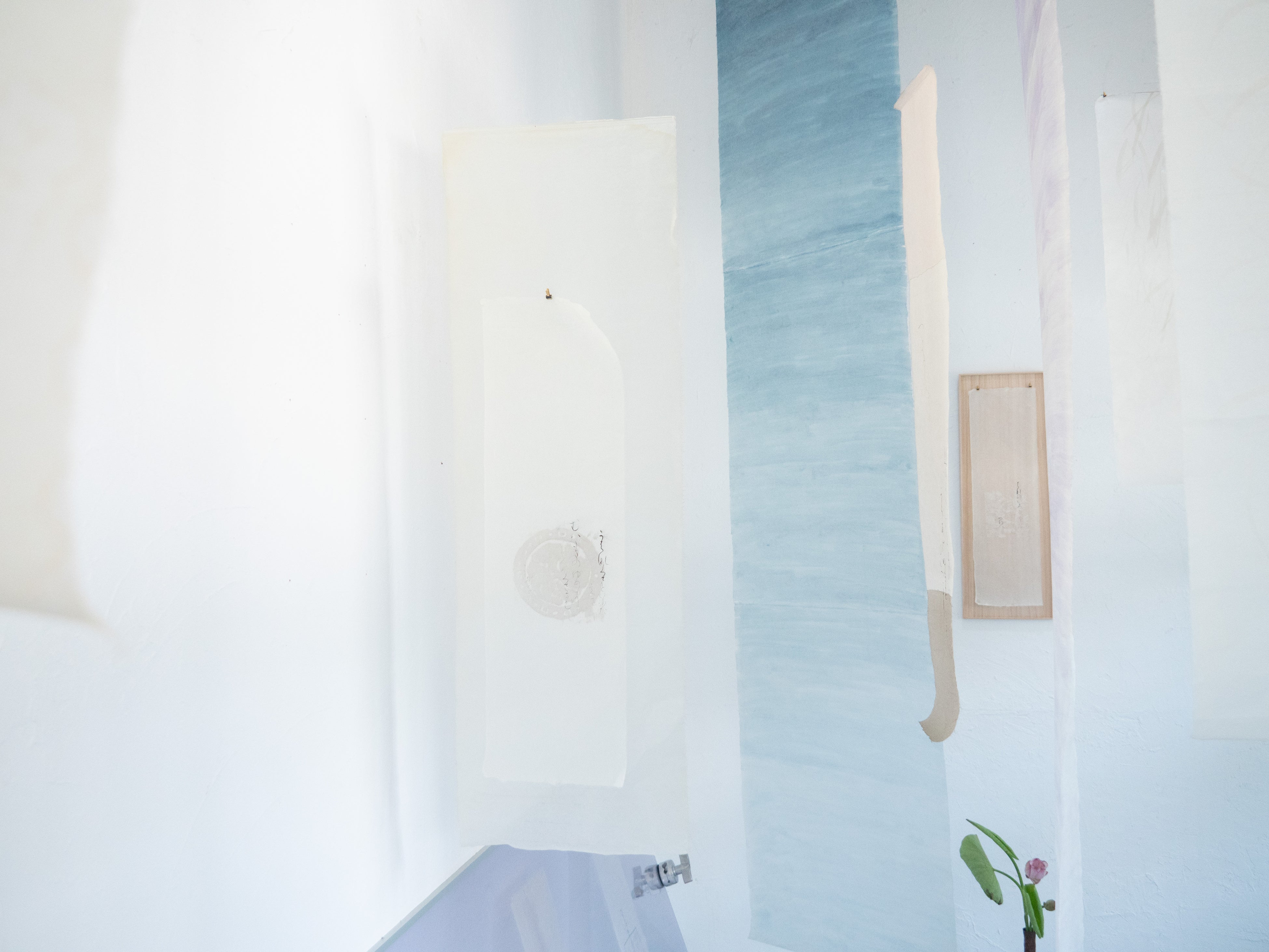 今回の展示では、箕浦氏の《文字と色の世界》の融合美、そして氏の、「揺れる、透ける、触れる」というテーマより再構成、閲覧者が作品の透明感や揺らぎなど、五感で感じられる淡い色彩と光の空間の中に演出されています。展示空間は、東京都内で長く続く表具師の協力の元、通常より大きな和紙達などで構成されております。