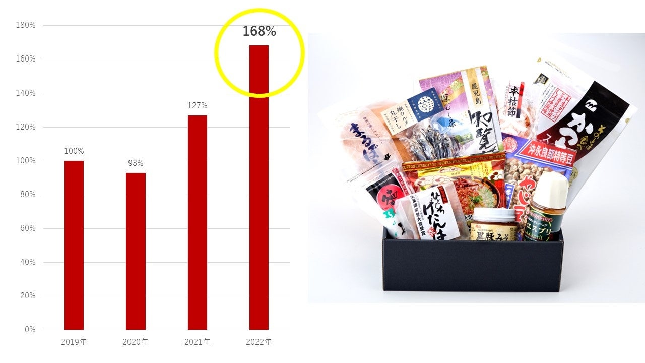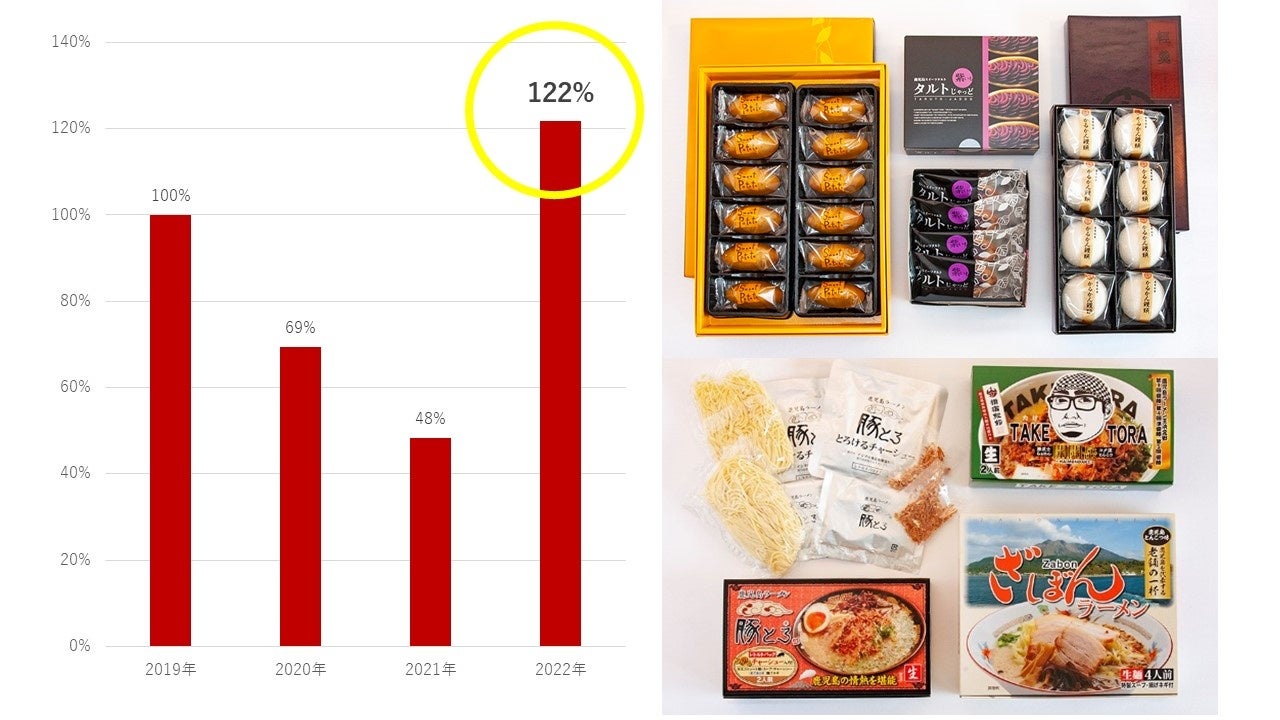 箱入り菓子・ラーメンなど、主としてお土産用でお買い求めいただくことが多い「お土産ジャンル」。コロナ禍の観光客減少の影響を大きく受けていましたが、今年はコロナ禍前の2019年を超える勢いとなっています。