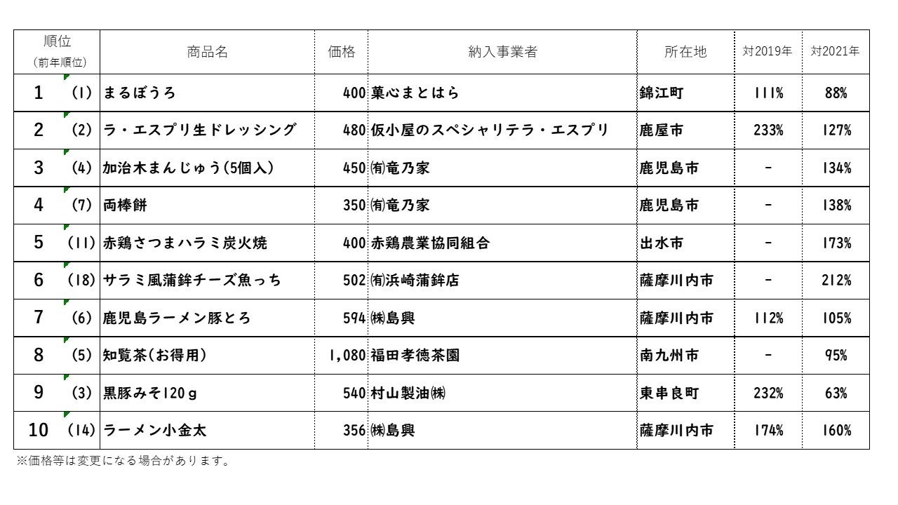 県内一円から集まった約1400アイテムの中から上位ランクインした商品は、鹿児島らしい定番商品に加え、初めてベスト10入りした新顔商品や、コロナ禍から3年目となった今年の新しい動きを感じさせるものとなりました。