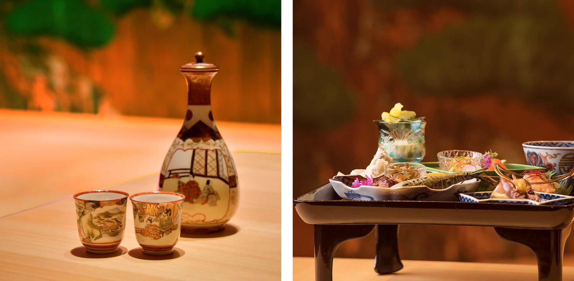 公演の後は、「天狗舞」の地元の食材を用いた四季折々のはしり・旬・名残の美味しさを余すことなく味わえるメインコースの特別版「風姿花伝 天狗舞スペシャル」(先付・御膳・焼物・食事・本日の甘味・抹茶)を提供します。能楽公演と共に日本酒を、続いて、能のリズム「序破急」で提供される料理と共に日本酒をお愉しみいただけるのは「水戯庵」ならではです。なお、17日(日)の食事は「花鏡 天狗舞スペシャル」(先付・御膳・本日の甘味・抹茶)を提供します。