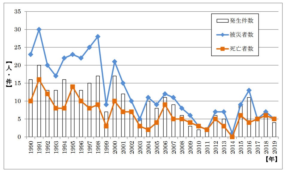 酸素欠乏症の労働災害発生状況の推移(1990年〜2019年)