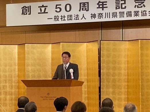 来賓に駆けつけていただいた黒岩祐治県知事から「生活安全産業として、治安維持などにご協力をいただいている。安全・安心な社会実現に向けて、今後もご協力をお願いしたい」と祝辞をいただきました。また、中山泰男全国警備業協会会長からも「業界とともに歩んできた50年。業界全体の歴史的にも寄与して、密接に対応してきた。引き続き、緊密な連携を図って様ざまな問題を解決していきたい」などと言葉をいただきました。