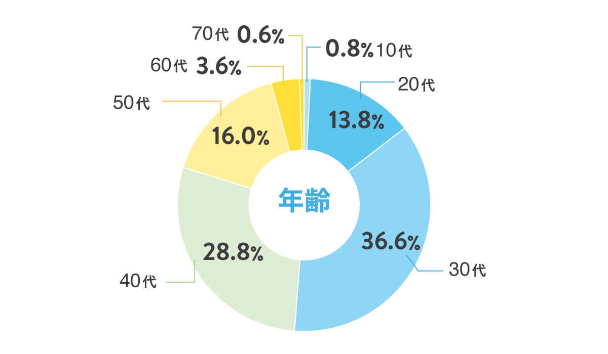 |10代:4名、20代:69名、30代:183名、40代:143名、50代:80名、60代:18名、70代:3名