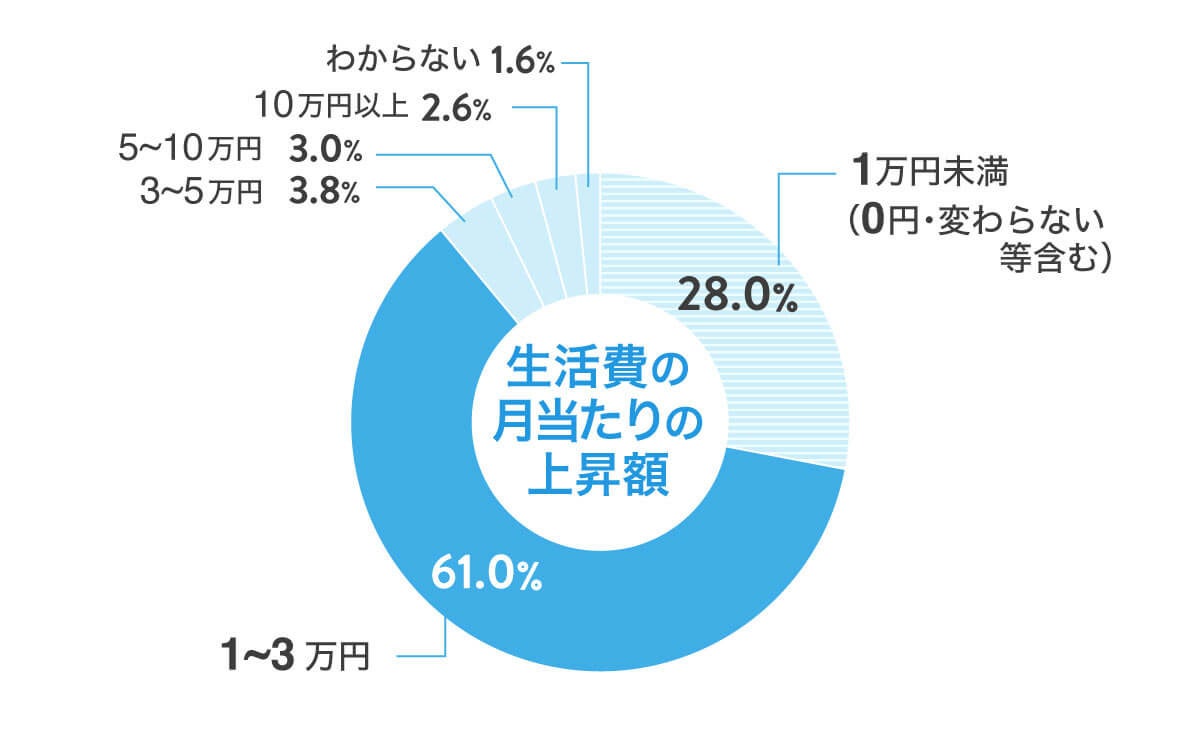 500名の方に「生活費は月にいくらくらい上がりましたか?」と伺ったところ、特に多かったのが1~3万円の61.0%。