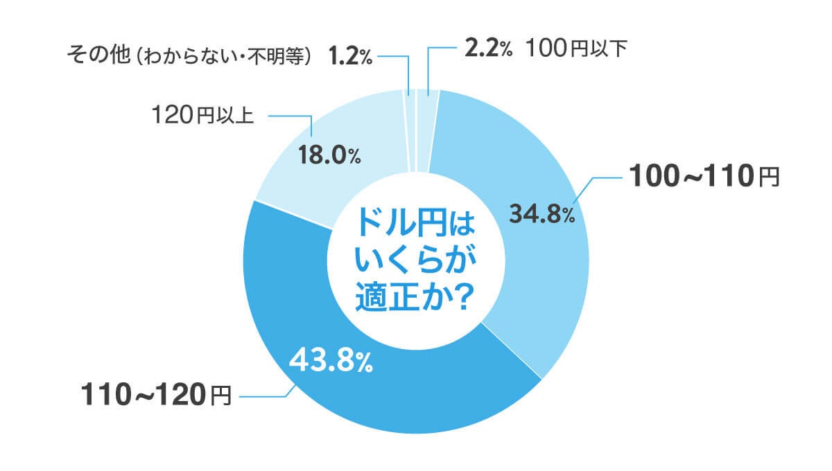 500名の方に「ドル円はいくらが適正だと思いますか?」と伺ったところ、特に多かったのが110~120円の43.8%。