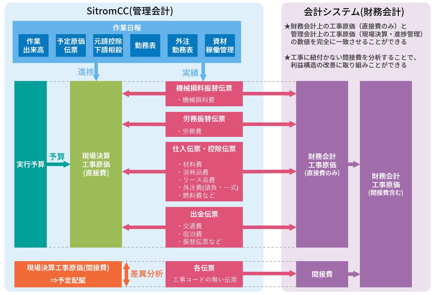 Sitrom-CCでは、会社で発生するすべての費用や収益等の伝票を登録し一元管理することができ、管理会計上の工事原価(現場決算・進捗管理)の数値を財務会計上の工事原価(直接費のみ)と完全に一致させることができるのです。 工事原価の分析だけではなく、工事に紐付かない間接費を分析することで、利益構造の改善に取り組むことができるようになります。