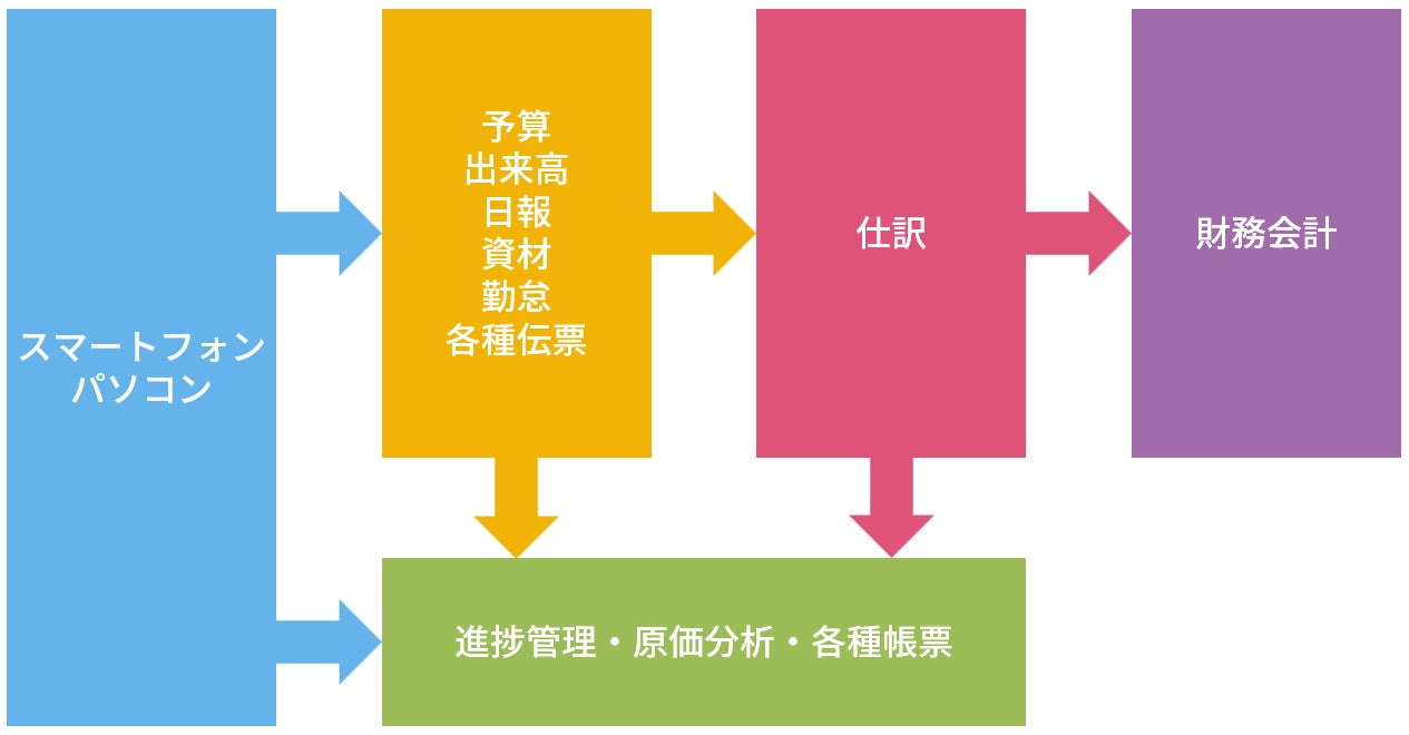 工事登録、実行予算、出来高などの工事管理、日報、勤怠、資材などの各種稼働管理、発注、支払、請求などの各種仕訳伝票登録など原価に関連する業務を一元化することで効率の良い業務運用を可能にします。
