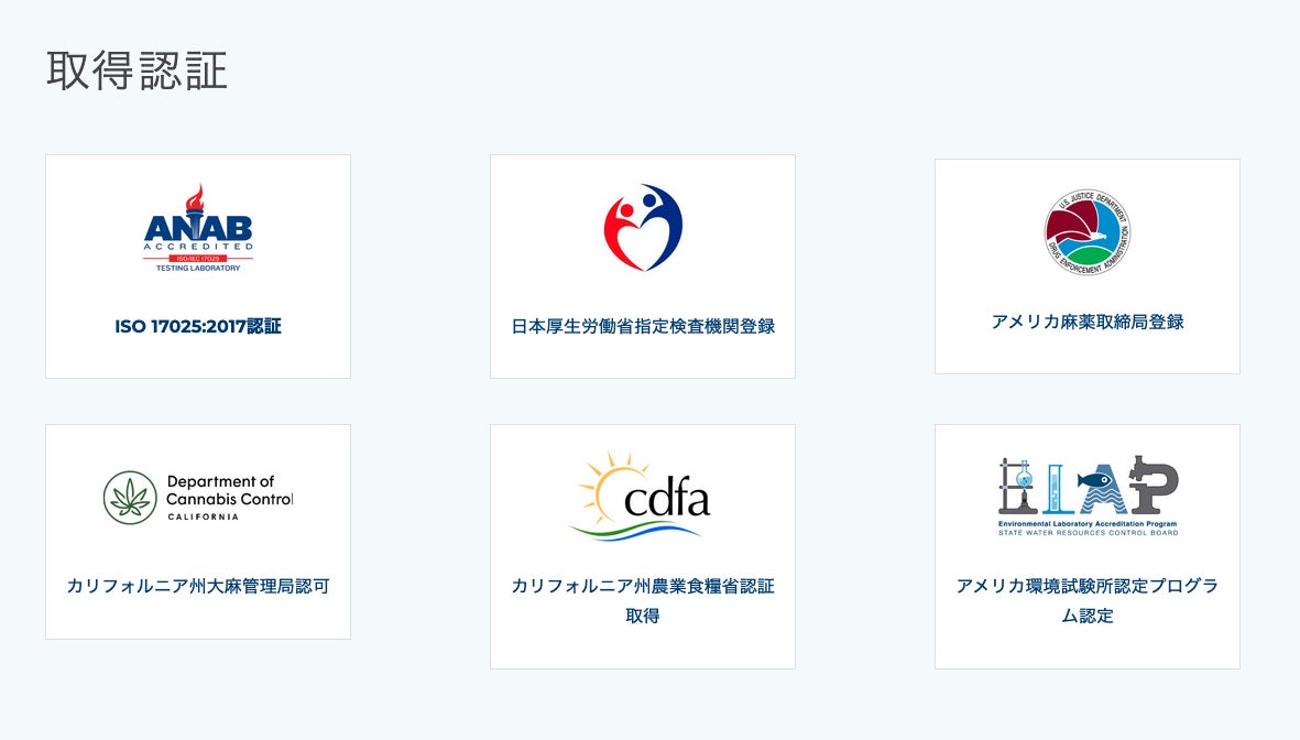 試験所・校正機関が正確な測定/校正結果を生み出す能力があるかどうかを第三者認定機関が認定する国際規格、ISO17025の取得はもちろんのこと、その他アメリカ麻薬取締局(DEA)、カリフォルニア州大麻管理局(DCC)、カリフォルニア州農業食糧省(CDFA)、アメリカ環境試験所認定プログラム(ELAP)などから認定を受けており、アメリカ国内ではその検査能力を高く評価されています。