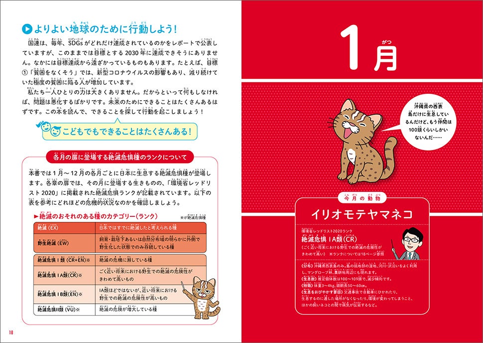 本書では、1月~12月の各月ごとに日本に生息する絶滅危惧種が登場します。飽きずに楽しく続けられます。