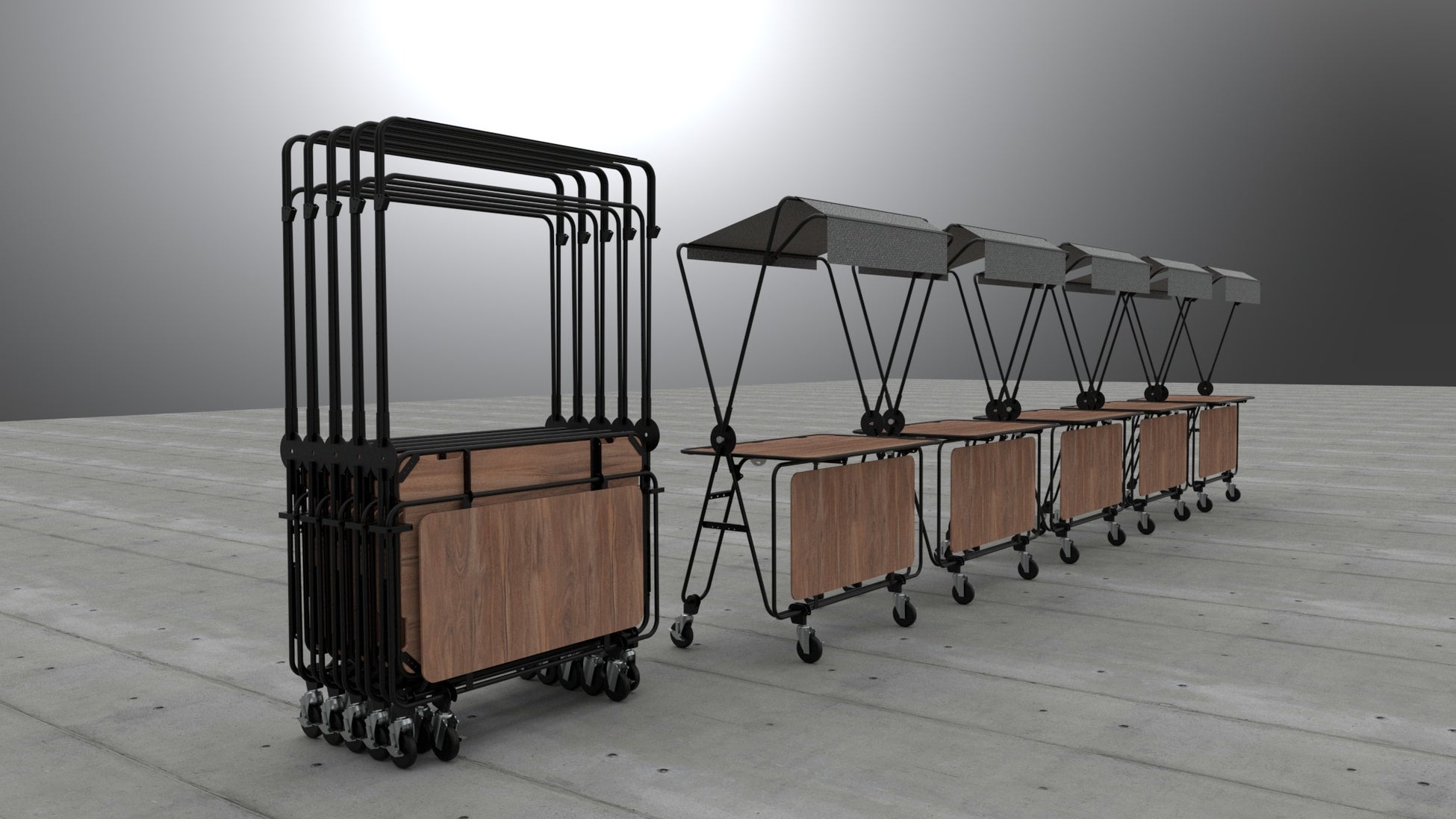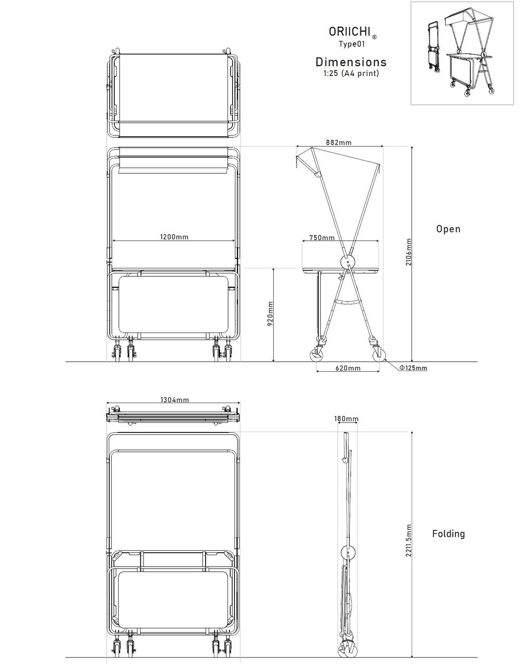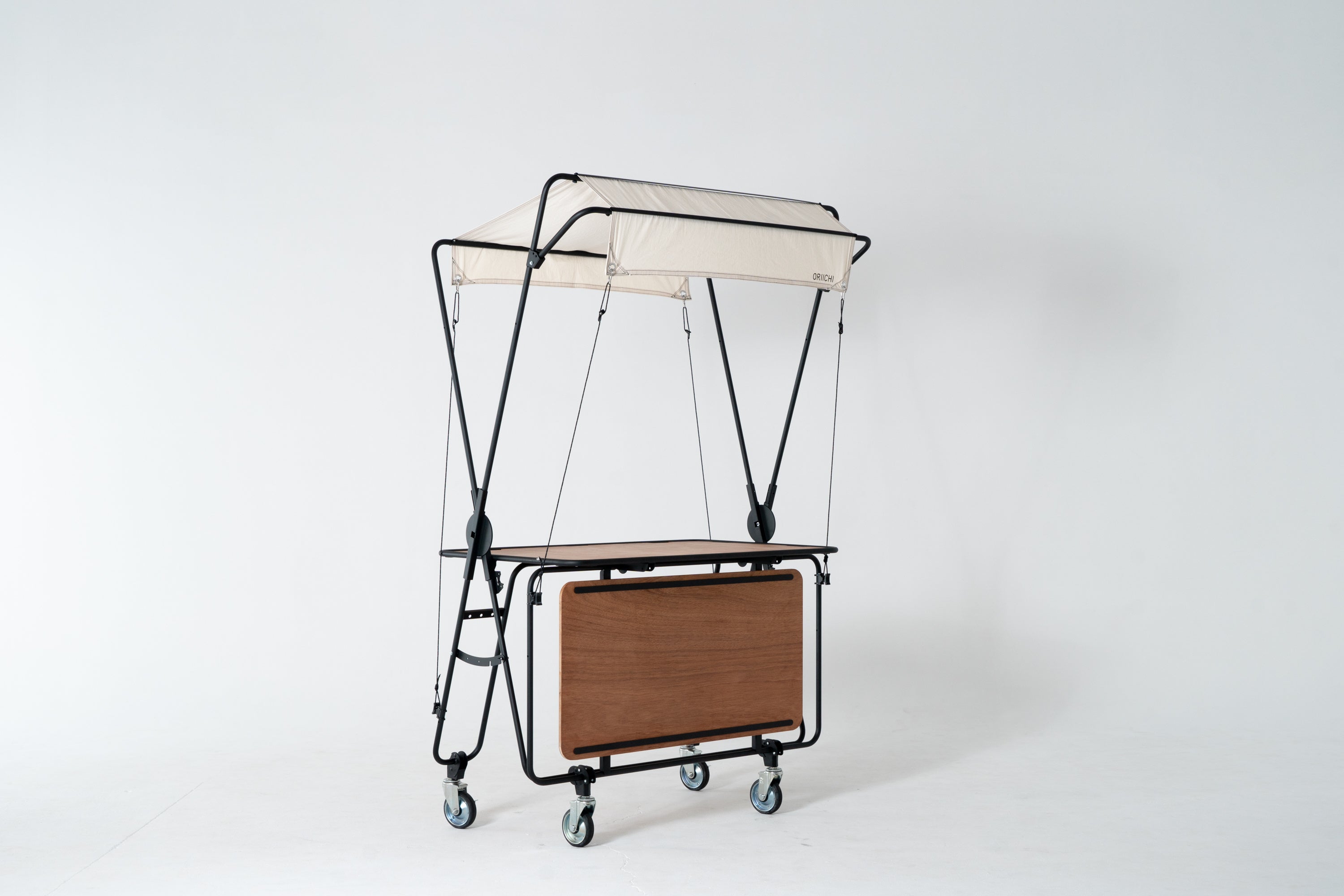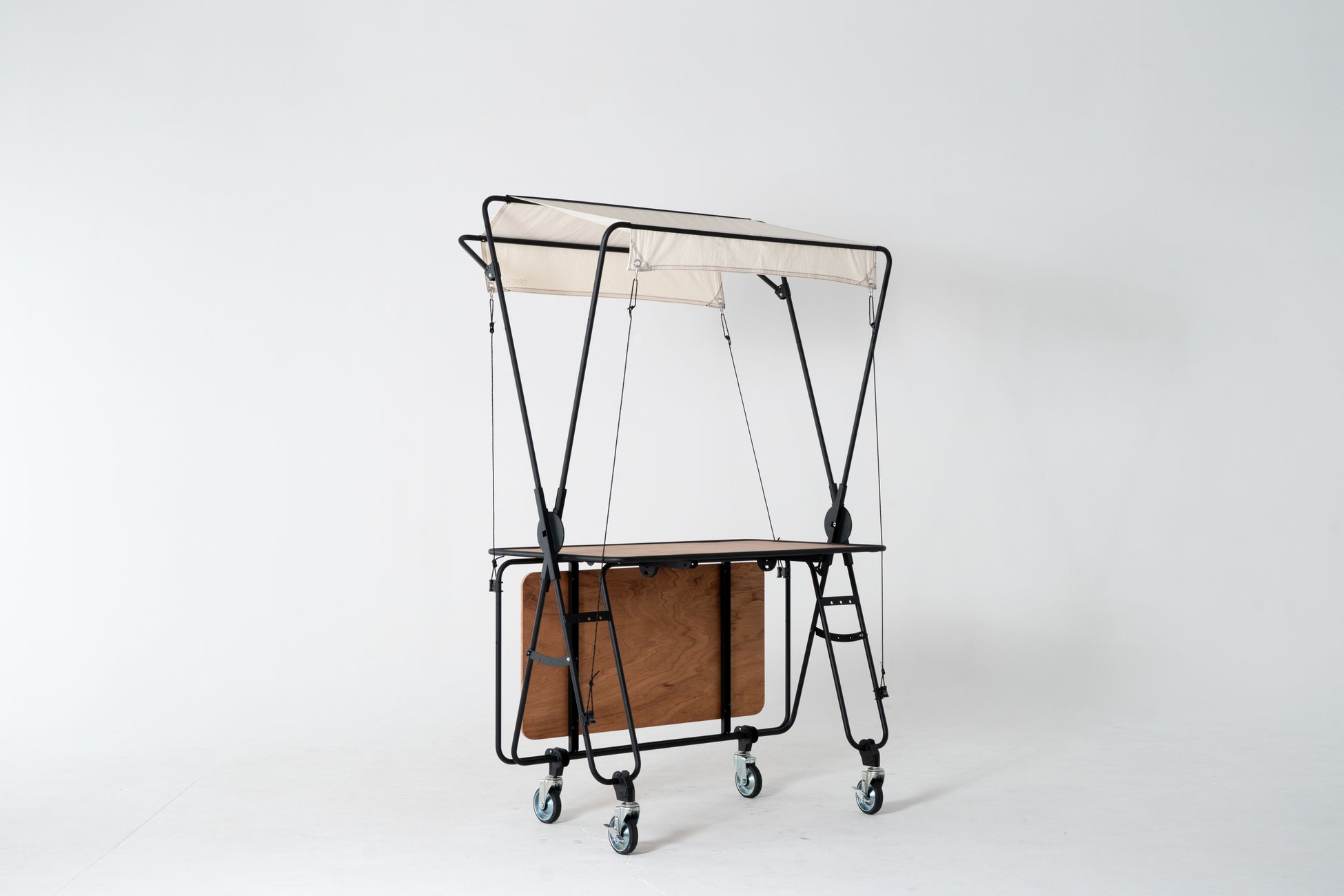 ORIICHI は多目的に活用される空間において簡単に折り畳み・展開可能なマルシェ用什器です。金属製のため頑丈で繰り返し使え、多くの ORIICHI を重ねてコンパクトに収納可能です。必要な時に広場や道など人が集う場所に展開し空間を活用しマルシェがひらけます。フレーム構造のカラーリングや天板やホロの布の仕様も多様にカスタマイズ可能です。