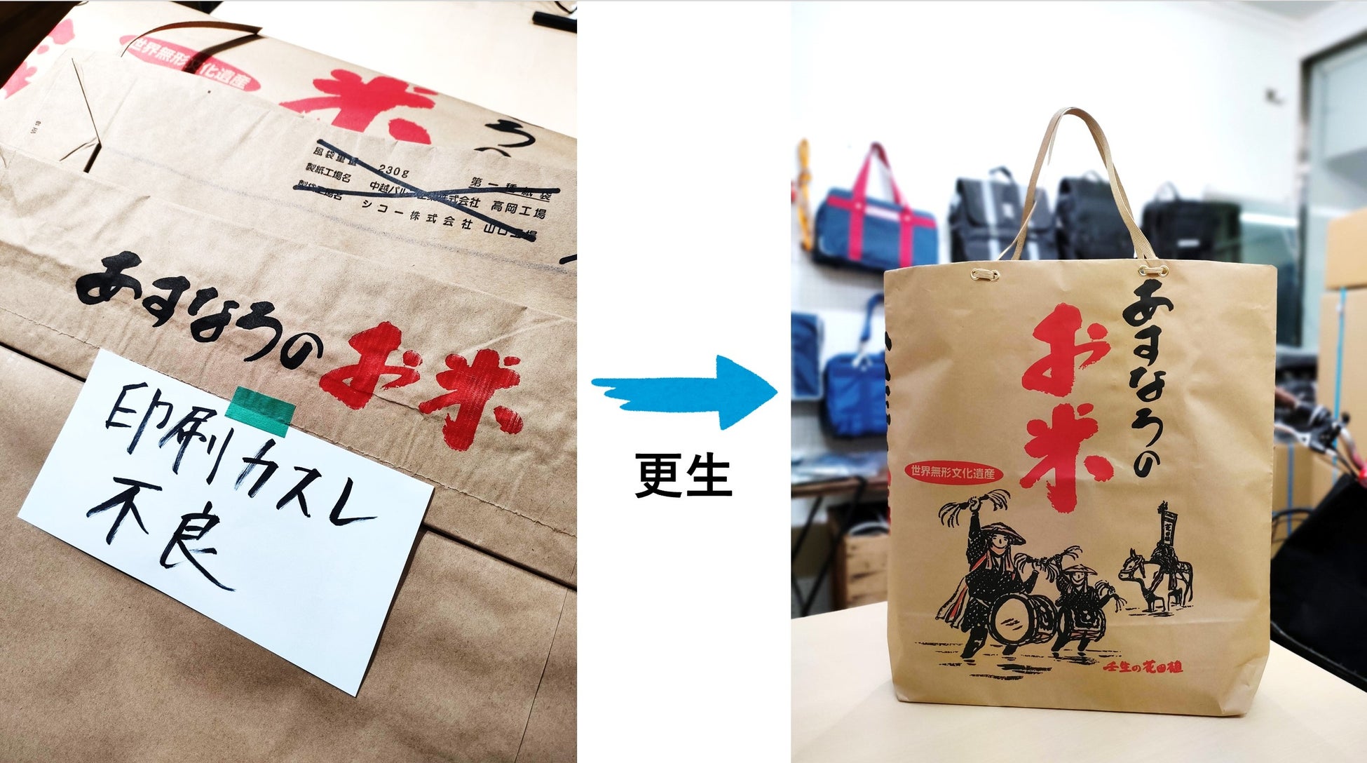 - シコー:米袋の生産において印刷不良によるロスが一定数発生しており、長年これらは再利用されず廃棄されるしかなく、「米袋としての性能は問題ないにも関わらず捨ててしまうのはもったいない」という悩み