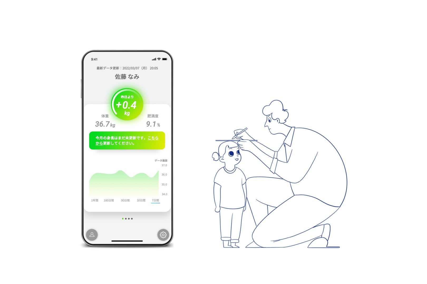 子どもの記録用「チャイルドモード」では、学校健康診断と同様の「肥満度」を確認できるほか、定期的に子どもの身長を測ることを促す通知機能を搭載することで、親は前向きに記録でき、その記録を見ながら子どもの成長を実感できます。