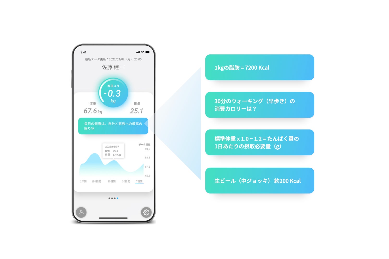 アプリを開くごとに、ユーザーにあった生活習慣に関する健康知識を分かりやすく、目立つ場所に表示することで、自然と健康知識を身につけることができます。これらの健康知識コンテンツは、日本肥満予防健康協会(https://www.himanyobou.jp/)と共同で作成しており、今後も充実させていきます。