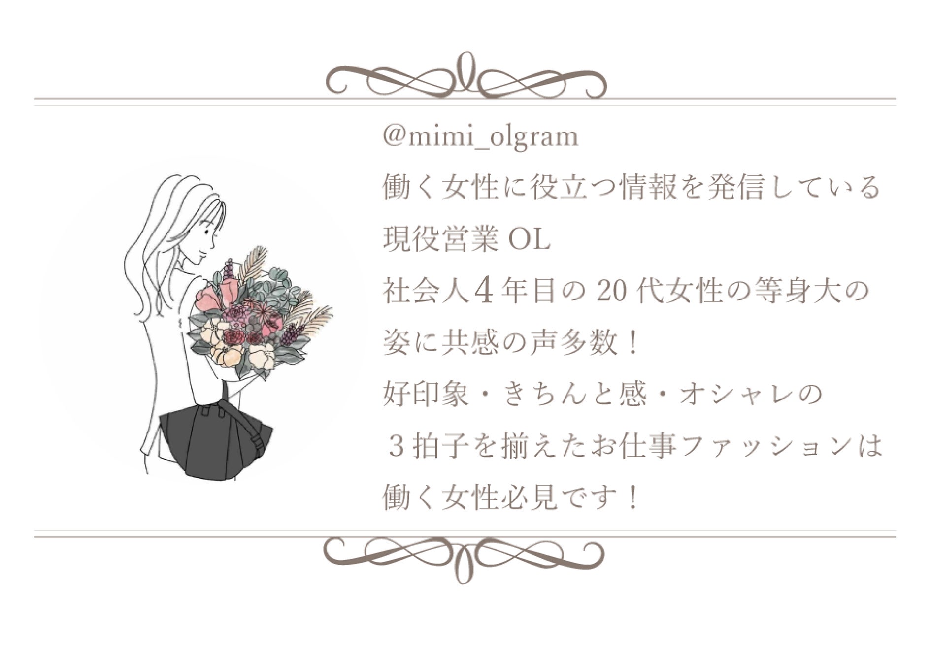 mimiさんは、働く女性に役立つ情報を発信している現役営業OL。社会人4年目の20代女性の等身大の姿に共感の声多数!好印象・きちんと感・オシャレの3拍子を揃えたお仕事ファッションは働く女性必見です。