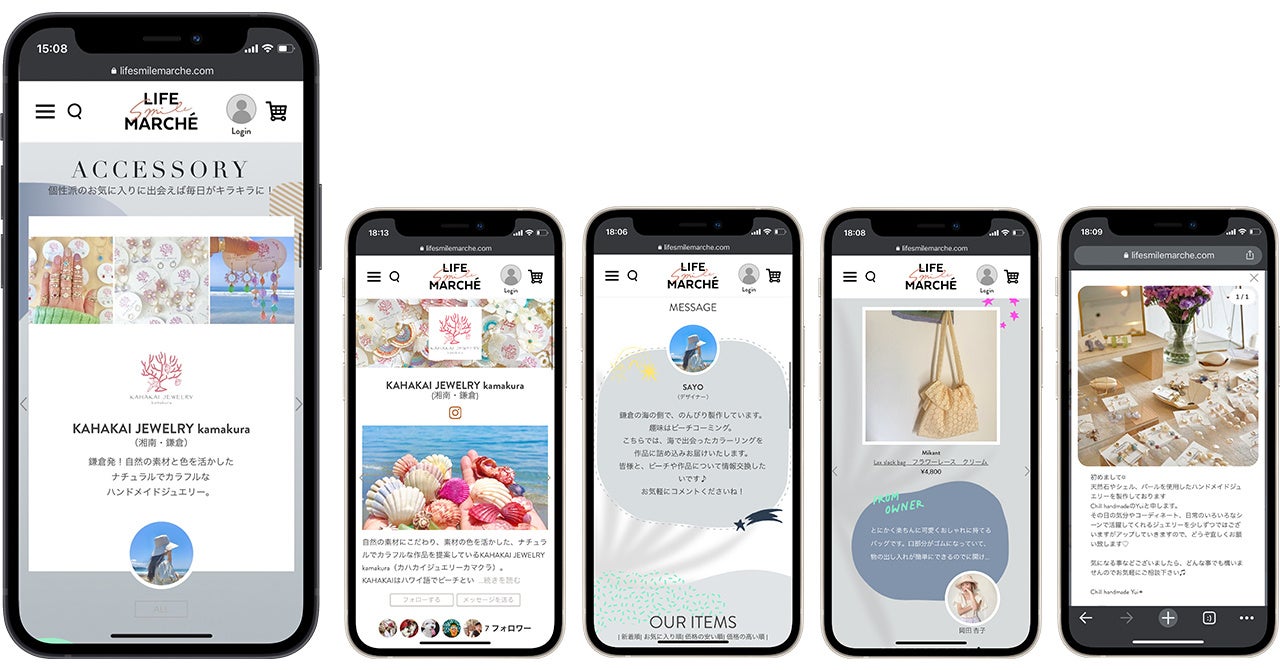 こだわったのは、商品が中心のいわゆるショッピングサイトではなく、実際のイベントの雰囲気を感じる“オンライン上のマルシェ”にすること。賑わいや楽しげな空気感だったり、商品を見るだけでワクワクする気分だったり、ショップの人との何気ないやり取りだったり、そんな“リアルなLIFE smile MARCHĒのいいところ”を大切にしてこのサイトをつくりました。