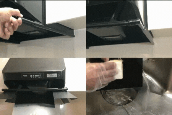 横幅が伸縮可能であらゆるレンジフードサイズに対応、軽くて取り付けも簡単、マグネット式パネル