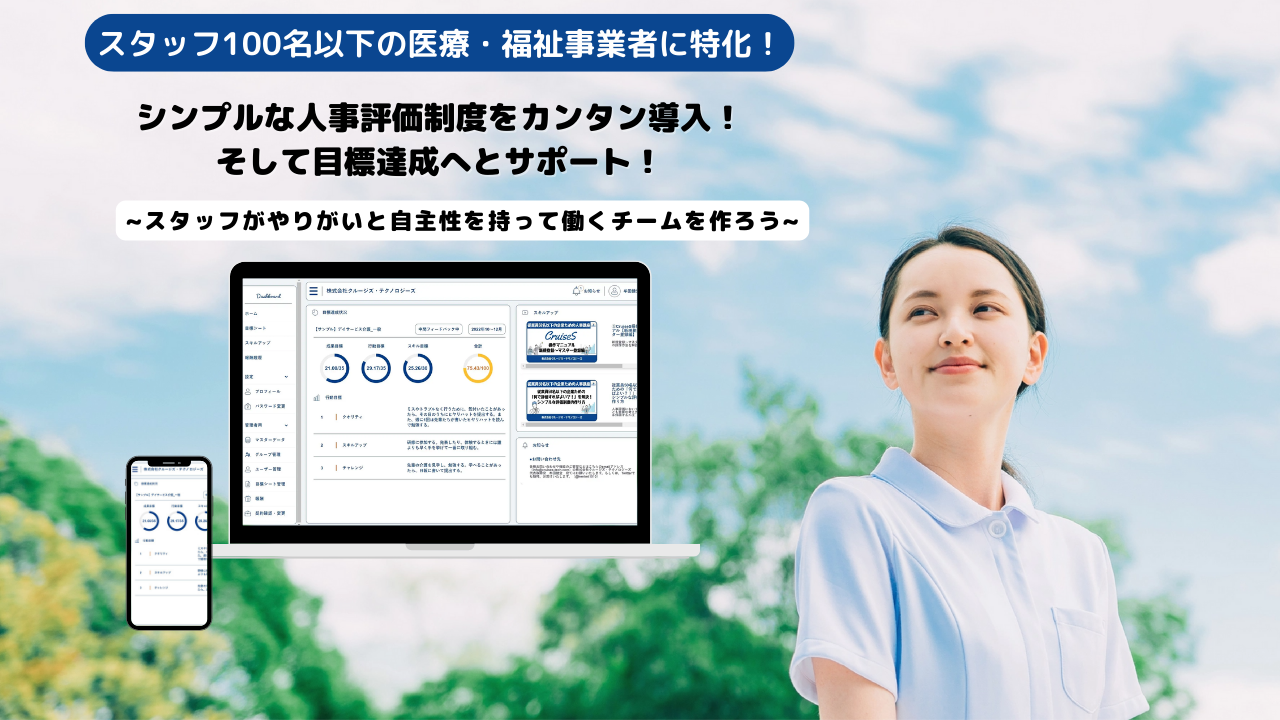 本サービスは、「納得感」や「難しい・高い・大変」と悩む全国の中小規模の医療・福祉事業者に向けて、職種や役職ごとに体系化された3,000以上に及ぶ評価指標のデータや簡単でシンプルな評価シートにより、「無料で簡単に、人事評価制度を作り、職員がやりがいと自主性をもって働く組織の土台を作り、目標達成まで支援する新しいHRテックのサービスです。