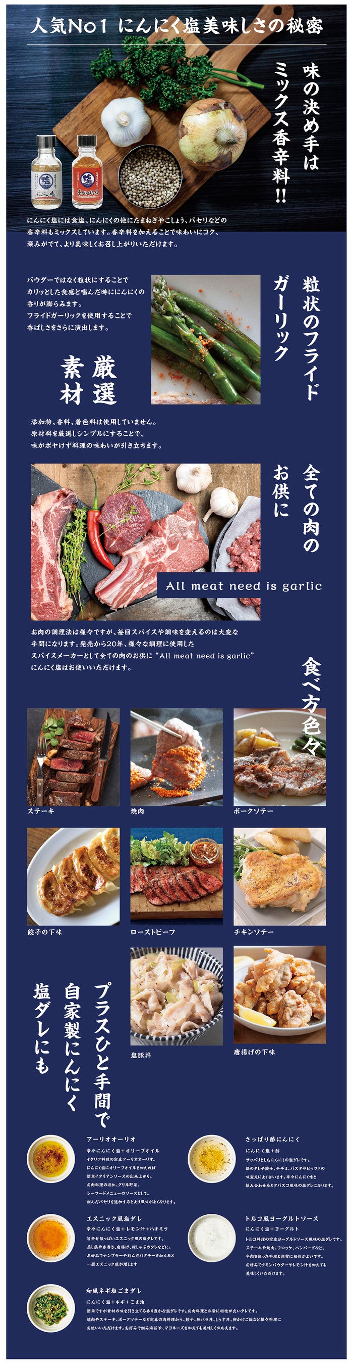 食欲そそるにんにくの風味が生きた毎日使いたくなる塩。卓上にだして日々の料理の味付けに一家に一本、ぜひ! 肉や魚、野菜炒め、あらゆる素材との相性が良い使いやすい塩です。プレゼントしても喜ばれる塩