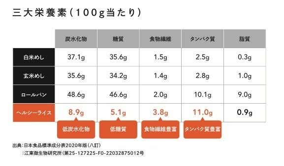 本問題の解消を目的に「SHAPEfood」は独自に「ヘルシーライス」を開発。米対比で糖質85%off・タンパク質4倍・食物繊維2.5倍の食事を実現しました。