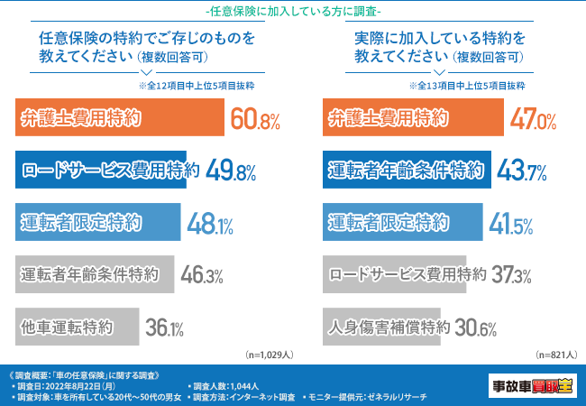 続いて、「実際に加入している特約を教えてください(複数回答可)」と質問したところ、『弁護士費用特約(47.0%)』と回答した方が最も多く、次いで『運転者年齢条件特約(43.7%)』『運転者限定特約(41.5%)』と続きました。
