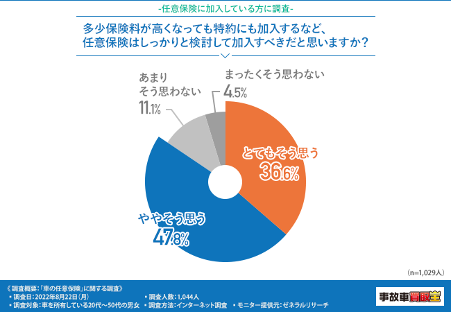 そこで、「多少保険料が高くなっても特約にも加入するなど、任意保険はしっかりと検討して加入すべきだと思いますか?」と質問したところ、8割以上の方が『とてもそう思う(36.6%)』『ややそう思う(47.8%)』と回答しました。