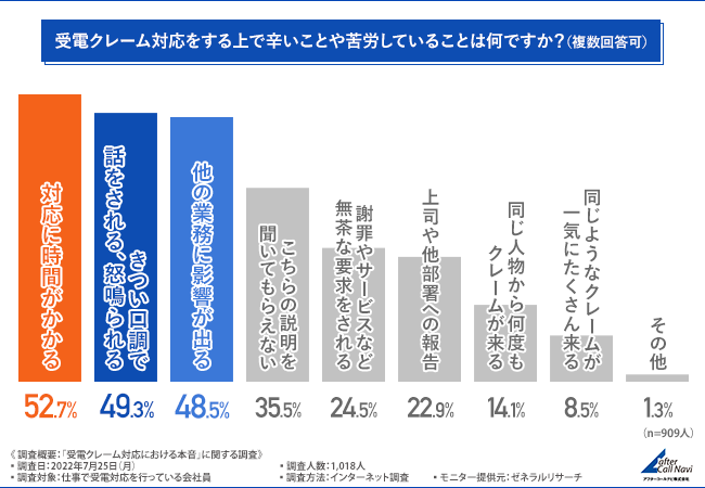 そこで、「受電クレーム対応をする上で辛いことや苦労していることは何ですか?(複数回答可)」と質問したところ、『対応に時間がかかる(52.7%)』と回答した方が最も多く、次いで『きつい口調で話をされる、怒鳴られる(49.3%)』『他の業務に影響が出る(48.5%)』と続きました。