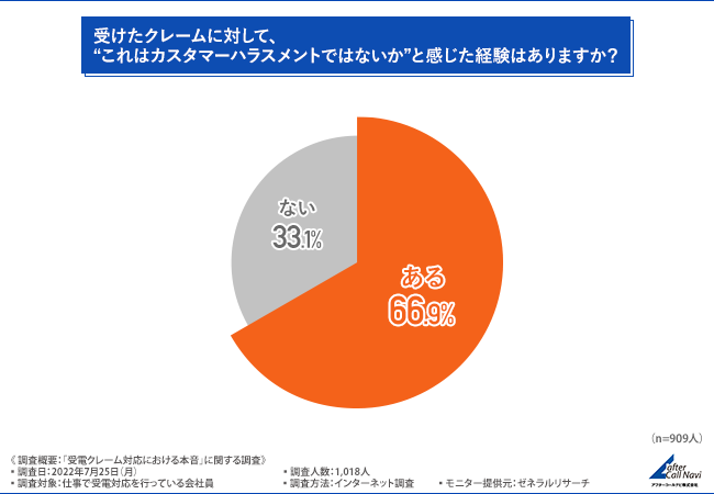 続いて、「受けたクレームに対して、“これはカスタマーハラスメントではないか”と感じた経験はありますか?」と質問したところ、6割以上の方が『ある(66.9%)』と回答しました。