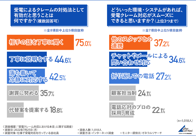 そこで、「受電によるクレームの対処法として有効だと思うことは何ですか?(複数回答可)」と質問したところ、『相手の話を丁寧に聞く(75.0%)』と回答した方が最も多く、次いで『丁寧に説明をする(44.6%)』『落ち着いて冷静に対応する(42.5%)』と続きました。