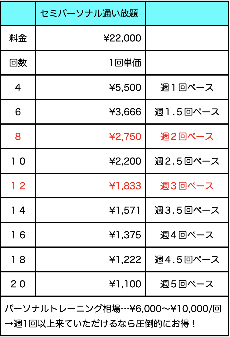 地域最安値の月額料金でセミパーソナル通い放題プランを導入することで1回あたりのセッション料金を更に抑えることができます。週2回ペースだと1回あたり¥2,750、週3回ペースだと1回あたり¥1,833と1回あたりのセッション料金が通った分だけお得になります。初心者から女性、お年寄りと老若男女問わず安心してパーソナルトレーニングを受けることができます。