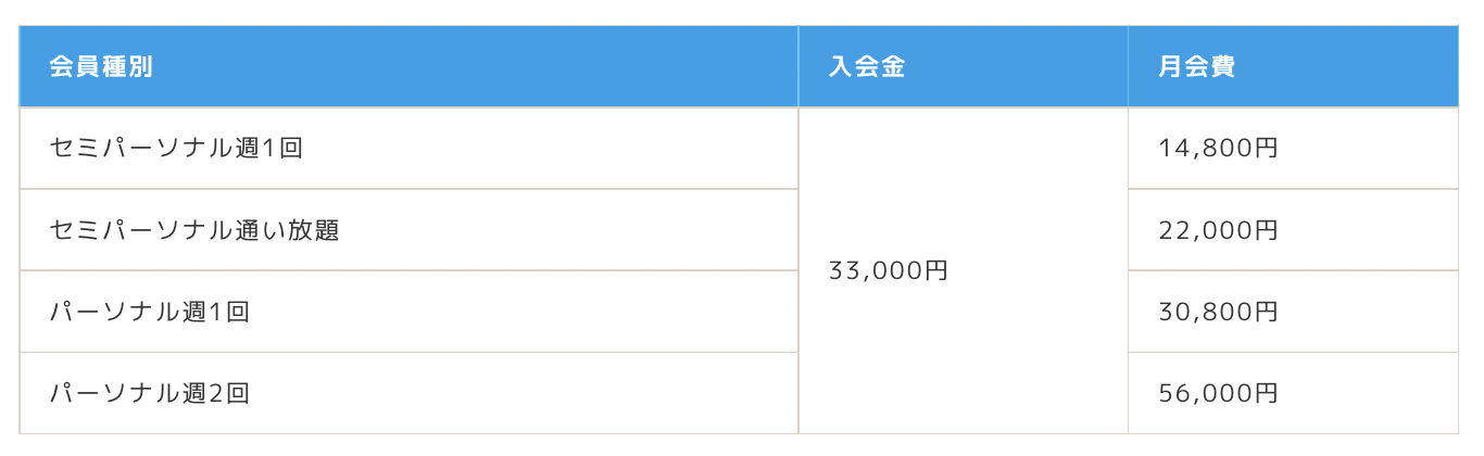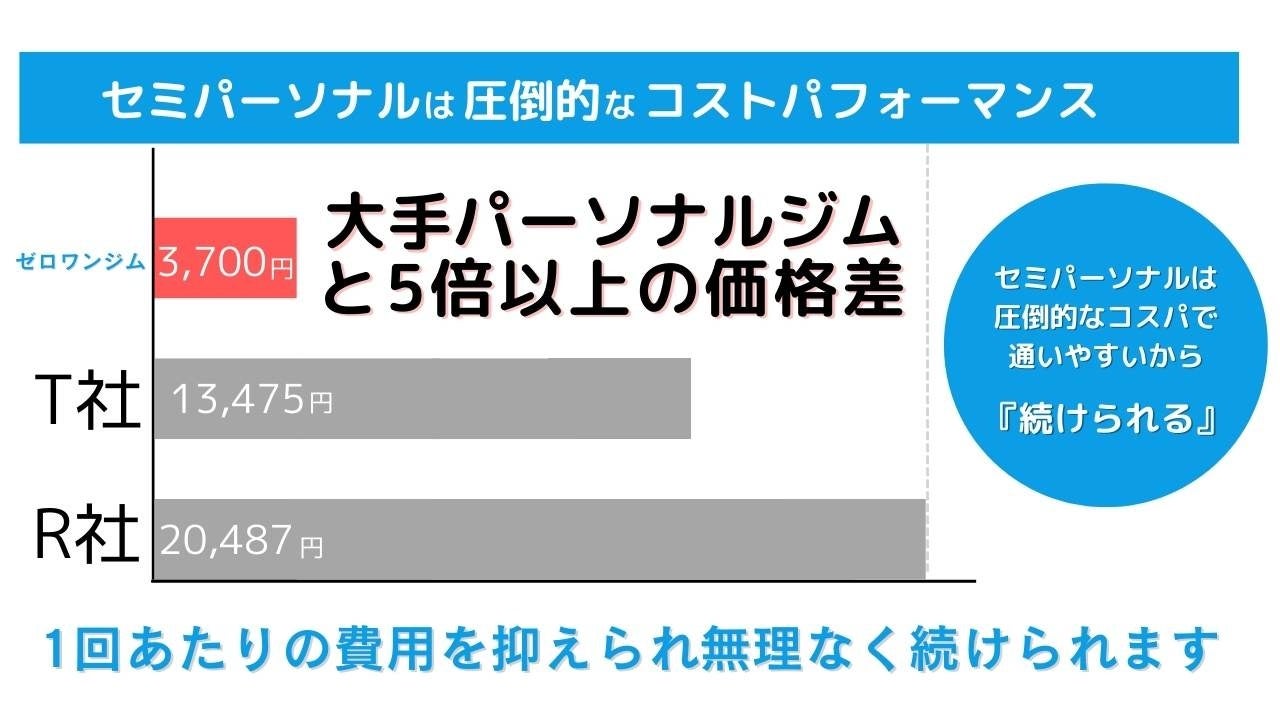 従来の大手パーソナルジムは2~3ヶ月の短期コースで20~40万円という価格でしたが、ゼロワンジムでは月額14,800円で1回あたり3,700円、更に月額22,000円の通い放題というシステムを採用しております。
