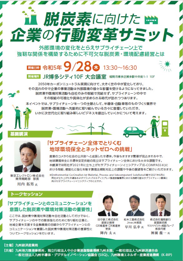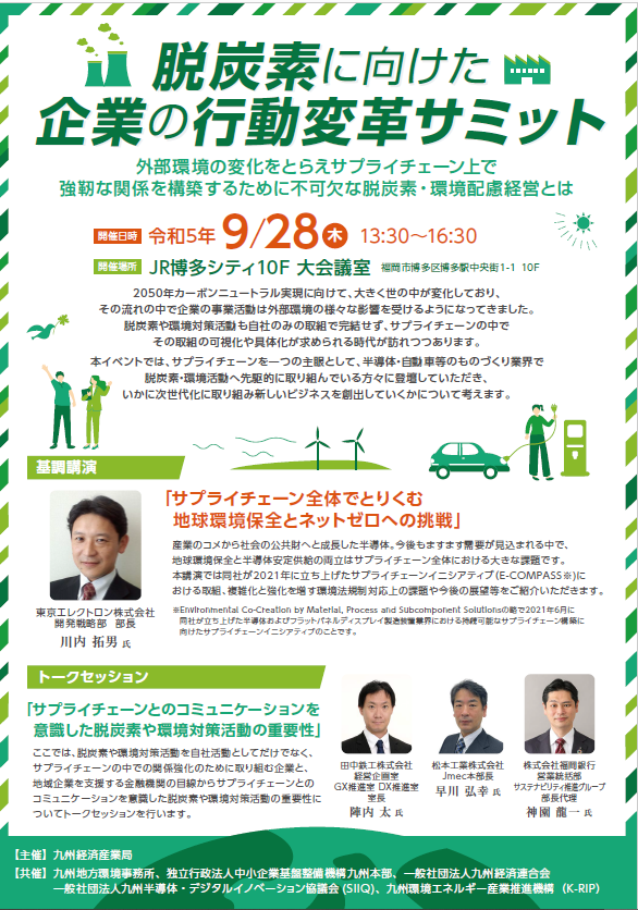 このため九州経済産業局は、2023年9月28日(木)にサプライチェーンを一つの主眼として「脱炭素に向けた企業の行動変革サミット」を開催します。サミットでは半導体・自動車等のものづくり業界で脱炭素・環境活動へ先駆的に取り組んでいる方々に登壇頂く予定であり、グローバル企業の取組の講演、地域企業とステークホルダーとの議論を通じて、皆様の次世代化への取組、新しいビジネスの創出のヒントになる内容としています。皆様のご参加をお待ちしております。