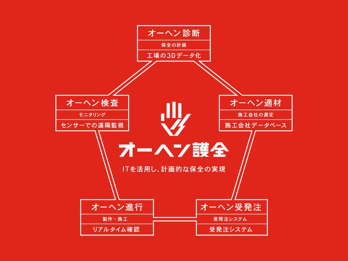 『オーヘン護全(ごぜん)』は、大型製造工場の「予防保全」を広め、工場の健康寿命を延ばして持続可能にするために開発した、”保つから護る”を実現するサービスです。工場の維持計画を作成し、施工会社の選定から、受発注、経過観察まで、大型製造工場の維持管理を行います。顧客の細かな要望にお応えするために、技術本部と営業が連携し、維持管理体制を構築。ご依頼から、施工会社のデータベースより最適な保全業者をご提案して保全業務を一括して行い、中長期的には、データベースの構築から維持管理のDX化を図ります。