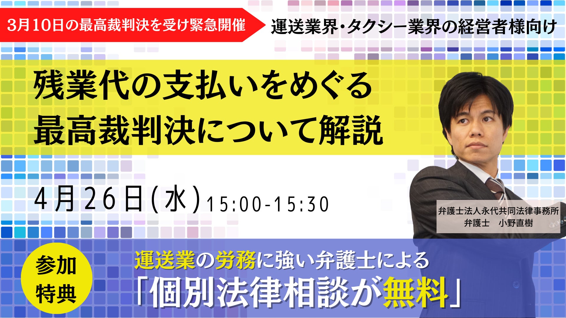 【オンラインセミナー】運送業者様向け「残業代の支払いをめぐる最高裁判決について解説」を2023年4月26日に開催