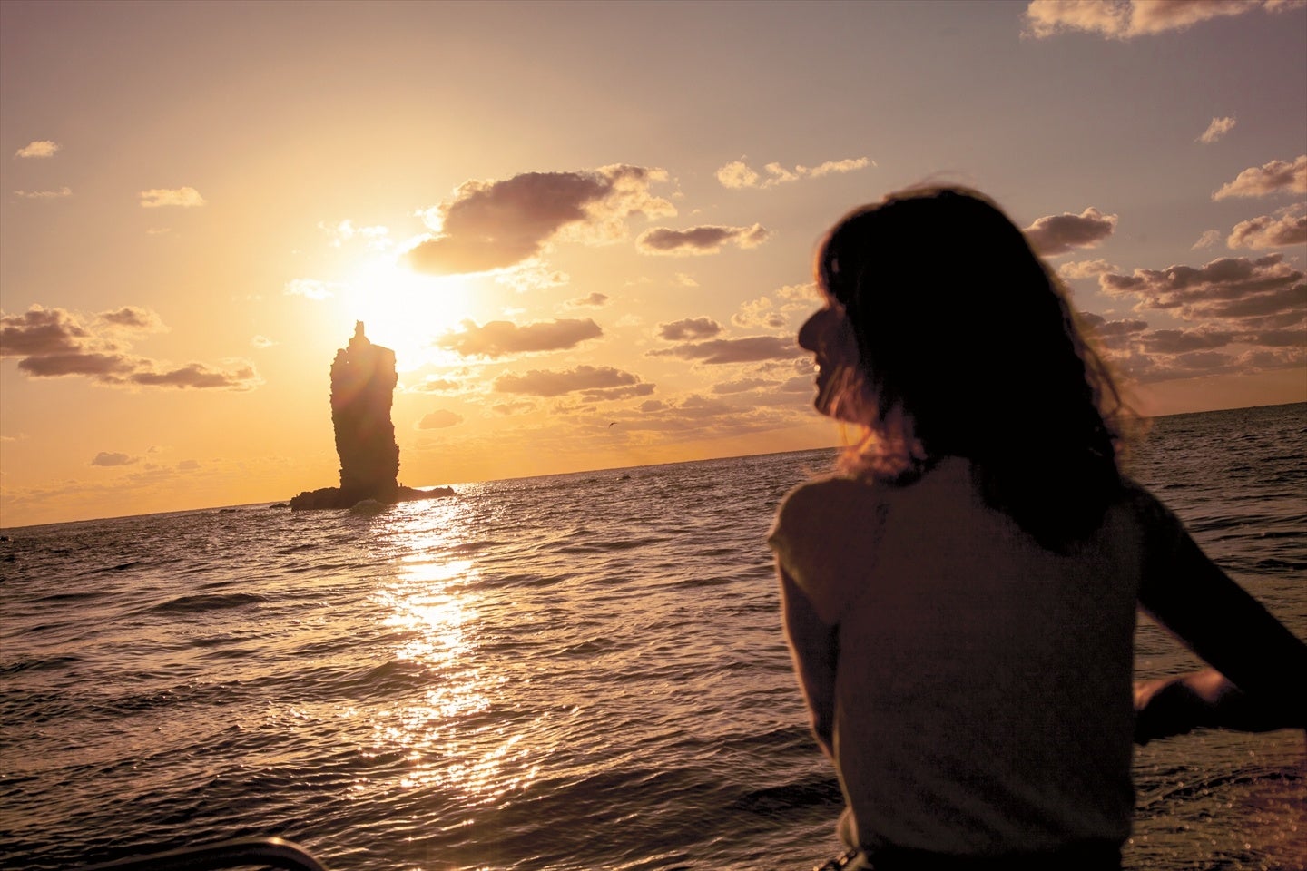 「ローソク島」に夕陽が灯る瞬間を遊覧船から眺める。