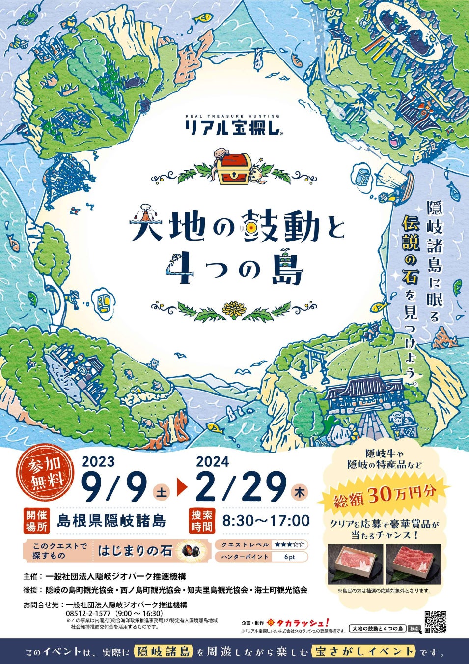 隠岐諸島に眠る “伝説の石” を見つけるべく、4つの島を周遊しながら謎解きを行うリアル宝探しを開催します。隠岐独自の自然景観や歴史的資産を1つのストーリーで結び付け、ゲーム感覚で隠岐の魅力に触れていただけるイベントです。