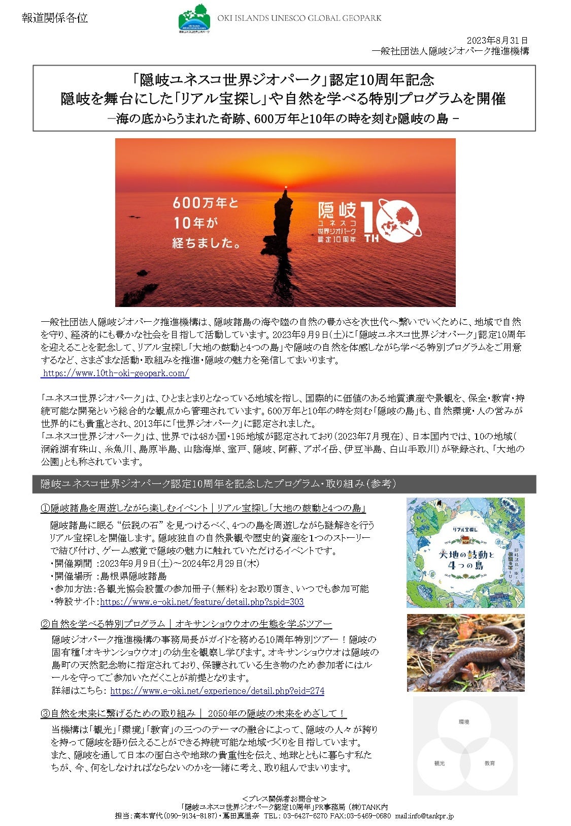 一般社団法人隠岐ジオパーク推進機構は、隠岐諸島の海や陸の自然の豊かさを次世代へ繋いでいくために、地域で自然を守り、経済的にも豊かな社会を目指して活動しています。2023年9月9日(土)に「隠岐ユネスコ世界ジオパーク」認定10周年を迎えることを記念して、リアル宝探し「大地の鼓動と4つの島」や隠岐の自然を体感しながら学べる特別プログラムをご用意するなど、さまざまな活動・取組みを推進・隠岐の魅力を発信してまいります。
