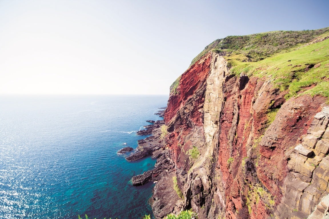 国の天然記念物に指定される、約1kmにわたって荒々しく削りとられた赤壁が続く断崖。