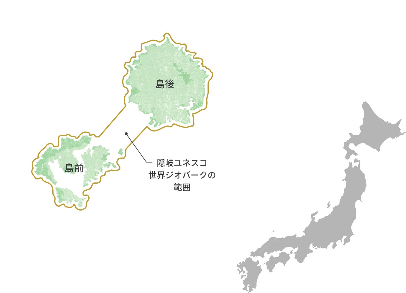 隠岐ユネスコ世界ジオパークは、数あるジオパークの中でも珍しい海域を含めたジオパークです。島根半島の北40~80kmの日本海に点在する4つの有人島と多数の無人島によって構成されており、陸域と海岸から1kmの海域をあわせた673.5km²(陸域346.0km²、海域327.5km²)を範囲としています。4つの有人島は、南に位置する島前(どうぜん)3島と、北に位置する島後(どうご)1島で構成されています。