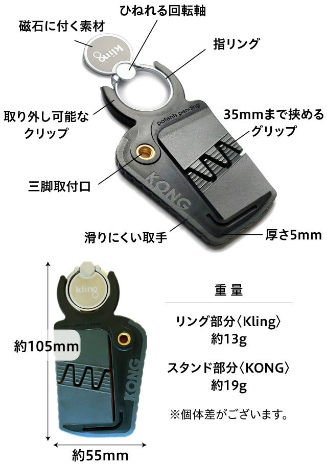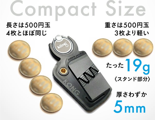 普段取り外して持ち運ぶスタンド部分(KONG)は小型軽量で薄く、持ち運びが非常に楽です。胸ポケットからサッと取り出せば1秒でスタンドとして利用できます。