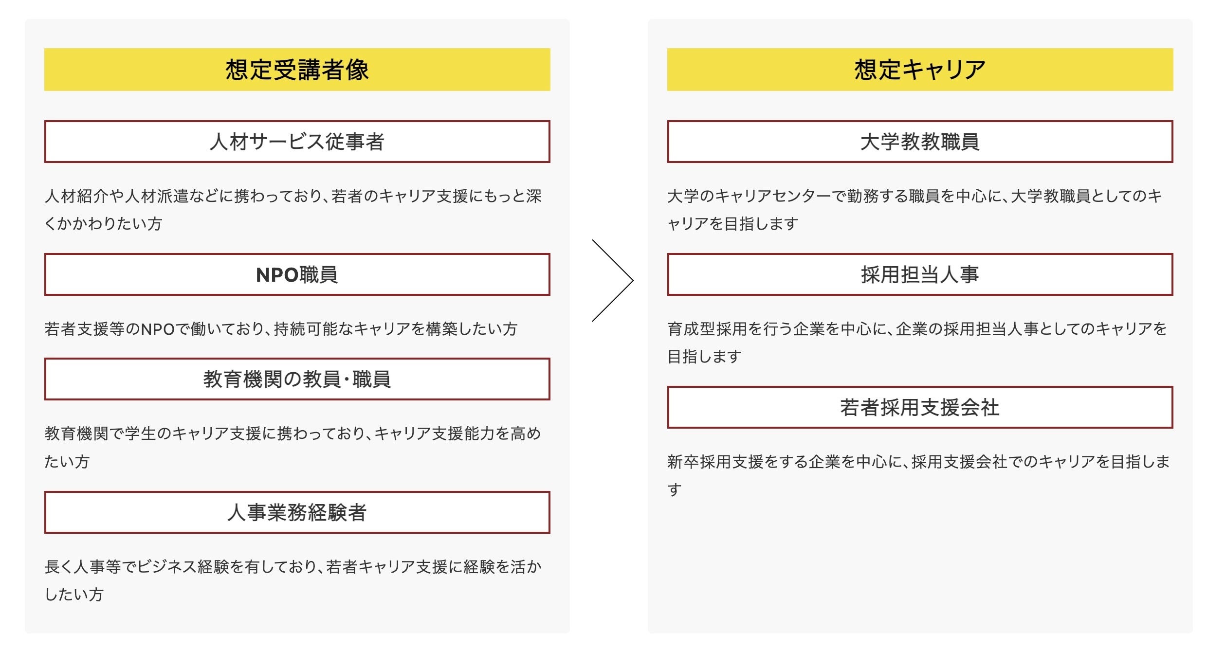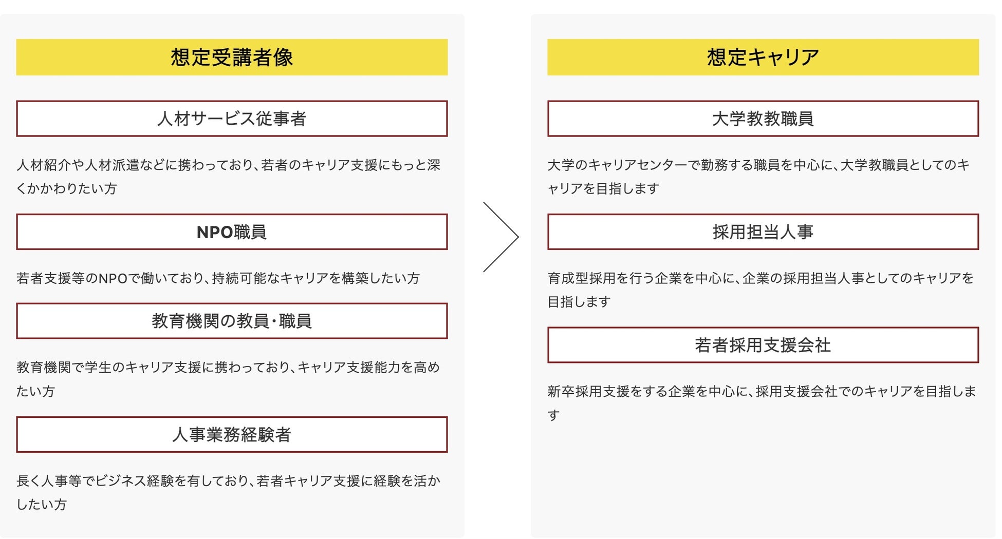 若者のキャリア支援に携わりたい!という方を対象に、キャリア支援家として大学職員や若年者採用担当人事として働くサポートを行います。講座では弊社が蓄積してきた、キャリア観やコミュケーション能力を用いて、成長途中の若者のキャリア支援や選考するためのノウハウを提供します。キャリアコンサルタント資格取得者は講座の一部が免除となりますが、未経験の方でも大歓迎です!