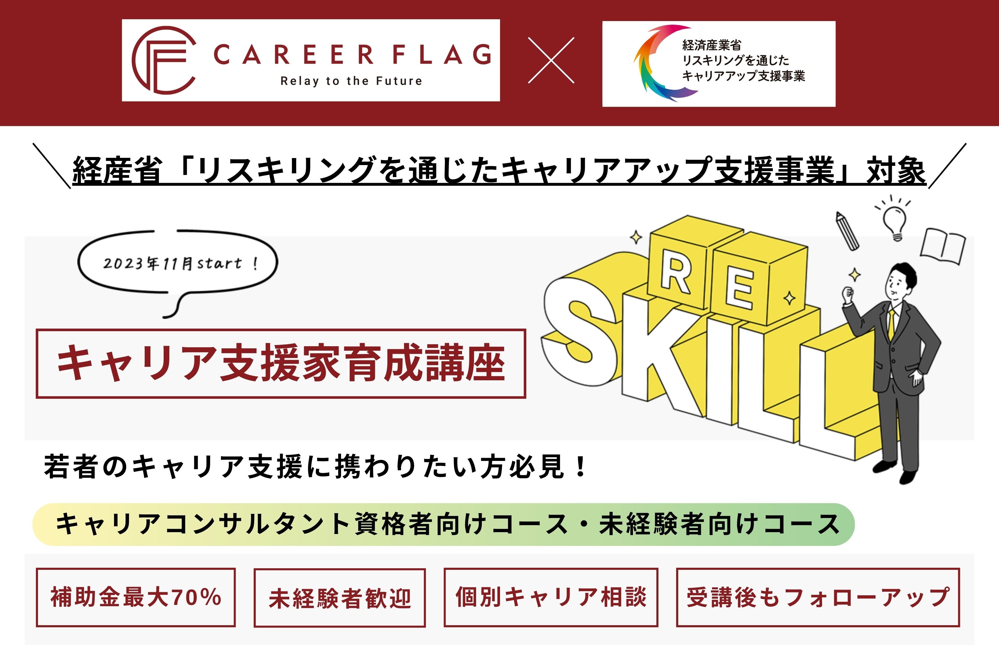 キャリアフラッグが「リスキリングを通じたキャリアアップ支援事業」対象企業の今!転職を目指すことを前提に講座や個別キャリア支援等を受ける場合、受講料が最大70%補助されます。