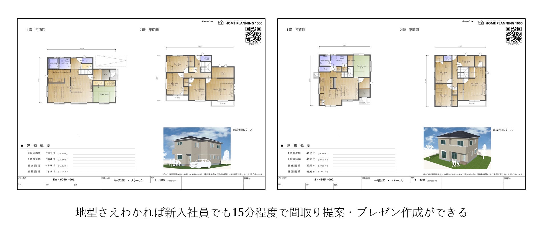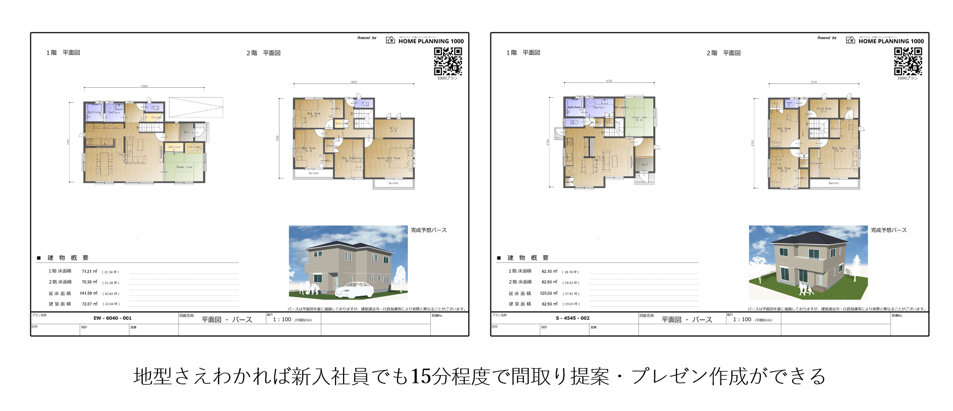 アナログな方法に思えますが、お客様もPCの画面やタブレットでプランを見せるより、印刷されたものを手に取って見せた方が納得することが多く、営業マンも機械の操作を覚える必要がないためすぐに使えるという利点がありました。また提案するプランも独自に編纂した汎用性の高い一般的な間取り図をベースにしているため、どんな敷地にも適用しやすい内容となっています。