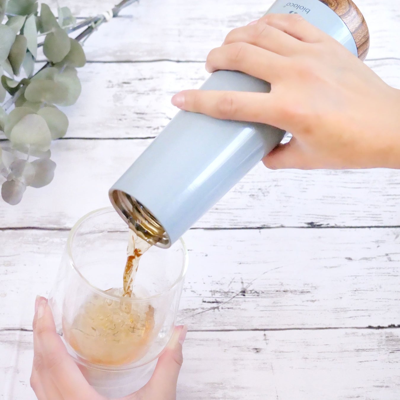 ドイツ生まれの軽量で氷がたっぷり入るサーモボトル。木のぬくもりとステンレスを合わせた新デザインで、軽くて持ち運びが楽。
