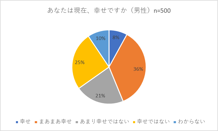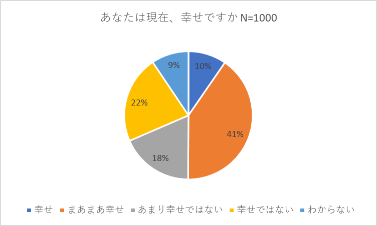 Ueda Keisho Corp.では1000人(男女各500人)に対して「あなたは現在、幸せですか」と質問したところ、「まあまあ幸せ」が41パーセントで最多となりました。「幸せ」と「まあまあ幸せ」を合わせた割合は51パーセントなり、「あまり幸せではない」と「幸せではない」の合計40パーセントを上回りました。