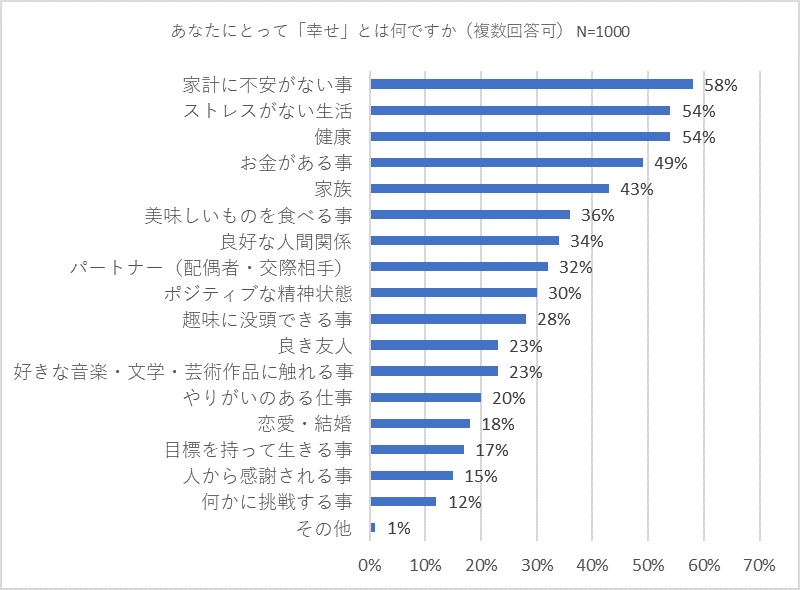 次に「あなたにとって『幸せ』とは何ですか」と複数回答可で尋ねたところ、「家計に不安がない事」が58パーセントでトップとなりました。2位に「ストレスがない生活」と「健康」が54パーセントで並び、さらに「お金があること」(49パーセント)、「家族」(43パーセント)が続きました。