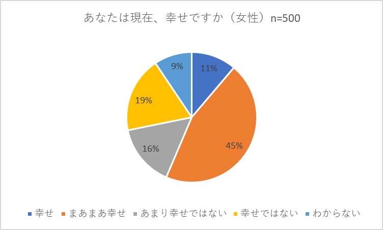 男女別では「幸せ」と「まあまあ幸せ」の合計が男性は44パーセント、女性が56パーセントとなり、女性の方が幸せを実感している人が多いという結果となりました。