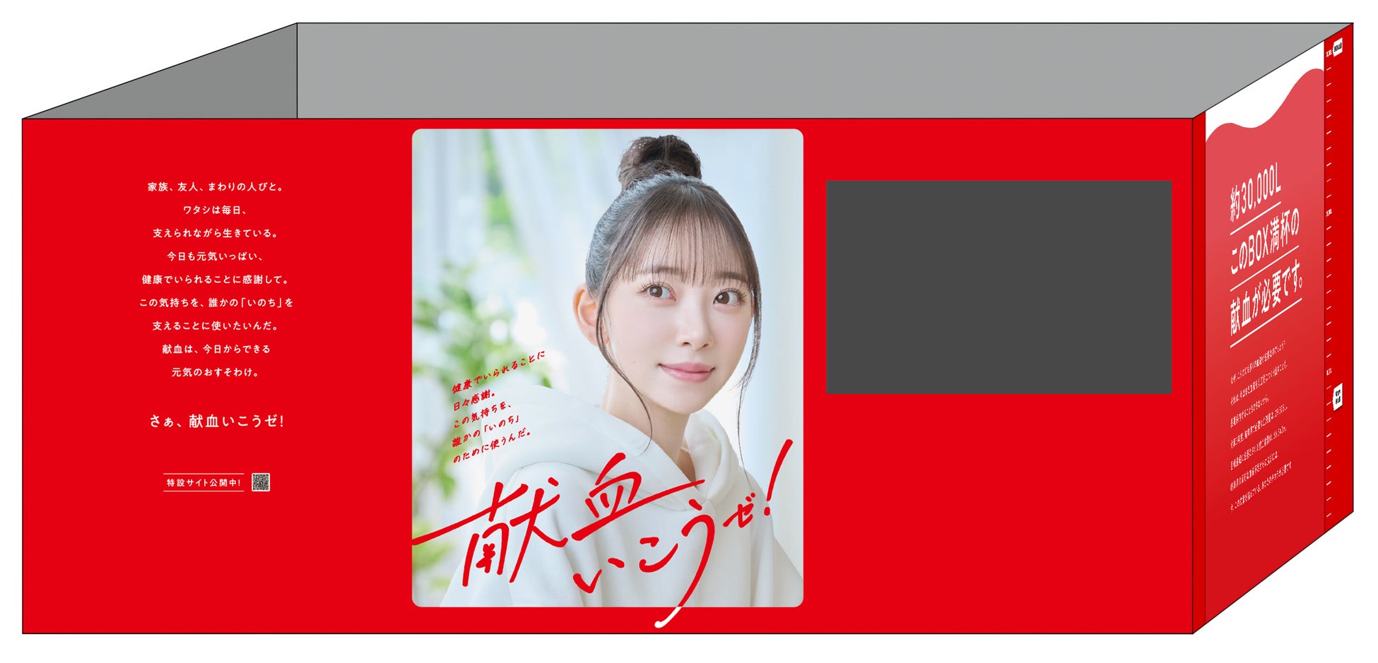 岐阜県で不足している献血量を知っていただくため、今年度の献血目標量である約3万リットルの体積の巨大ボックスを制作し、岐阜県内の商業施設にて公開します。巨大ボックスでは、堀未央奈さんの献血PR動画の放映やビジュアルの展示のほか、岐阜県内の若者がどんな時に献血に行きたいかの声を掲示し、様々な角度から献血に対して気づきを与えるものとなっております。
