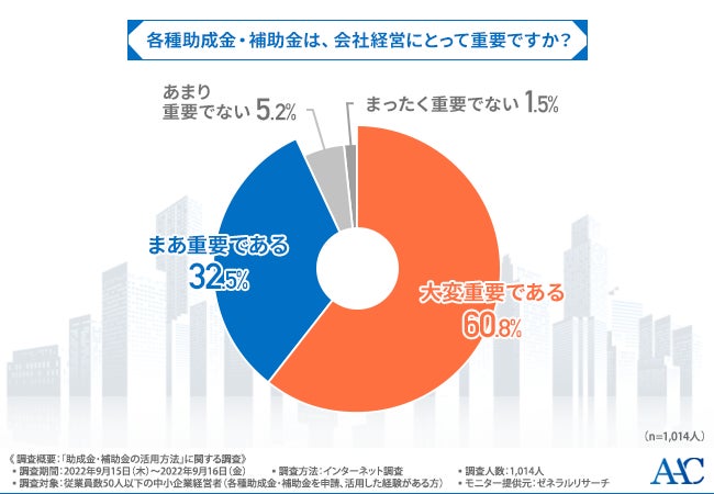 そこで、「各種助成金・補助金は、会社経営にとって重要ですか?」と質問したところ、『大変重要である(60.8%)』『まあ重要である(32.5%)』『あまり重要でない(5.2%)』『まったく重要でない(1.5%)』と9割以上が重要だと思っている様子が窺えました。