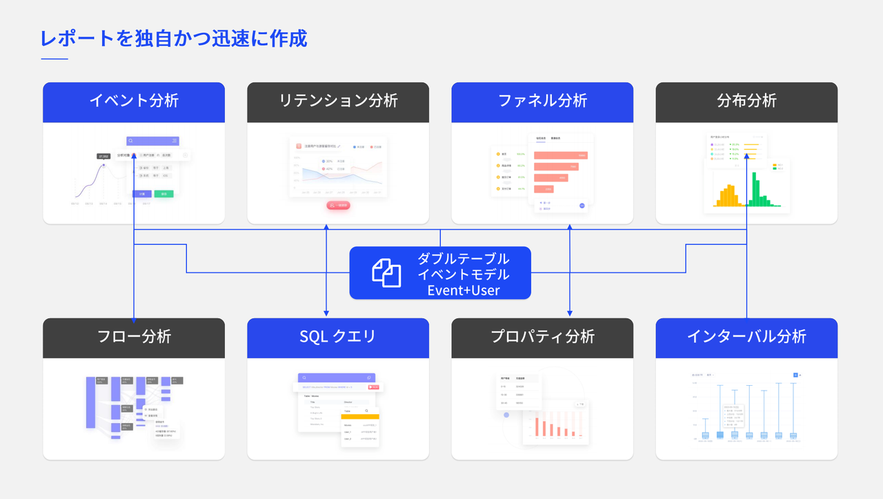 データ分析自体に焦点を当てると、Thinking Dataのゲーム向けビッグデータ分析プラットフォームはプリセットの様々な分析モデルを備えており、運営チームの課題解決を効率的に支援します。例えば、「イベント分析モデル」はゲームの各コア指標をリアルタイムでマークし、ユーザーの行動変化の傾向を観察することができます。「保存分析モデル」は初期行働と訪問行働を柔軟に選択することで、指定時間内におけるユーザー変化を可視化。そして「ファネル分析モデル」はユーザージャーニーを可視化することで、ゲーム内の主要な離脱ポイントの特定を支援します。